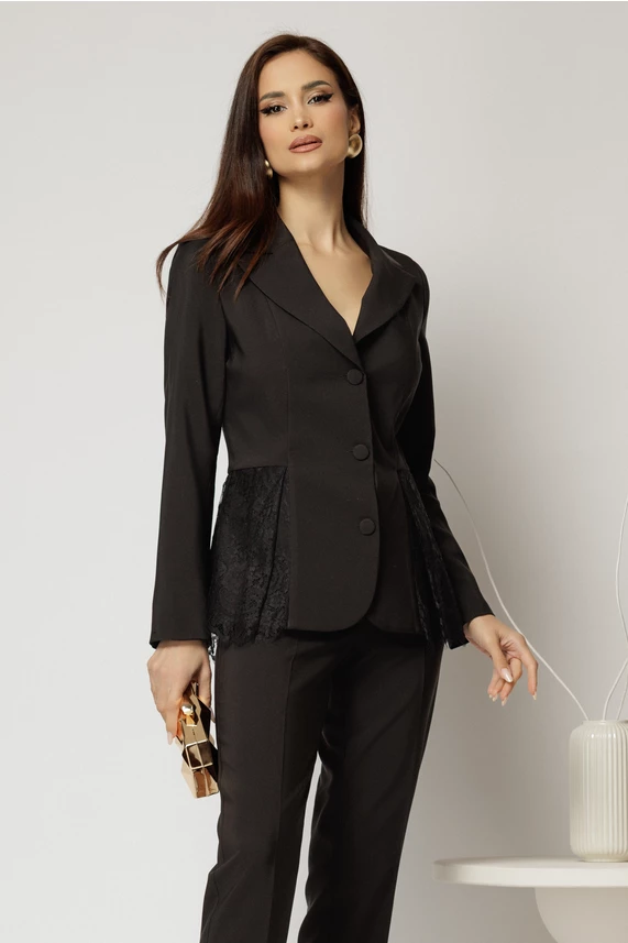 Este un sacou elegant de ocazie, de culoare neagra, cu insertii din dantela. Sacoul are croiul cambrat, peplum usor si inchidere la trei nasturi.