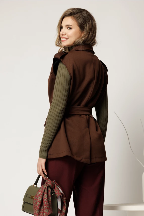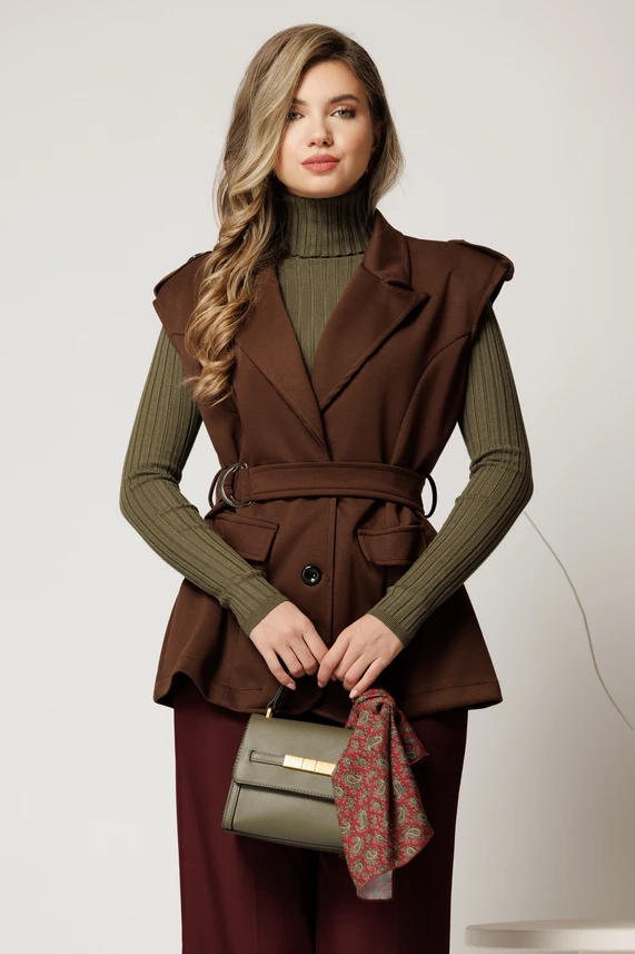 Vesta din viscoza cu croi cambrat si cordon detasabil in talie. Are rever clasic se inchide cu nasturi si are buzunare false.