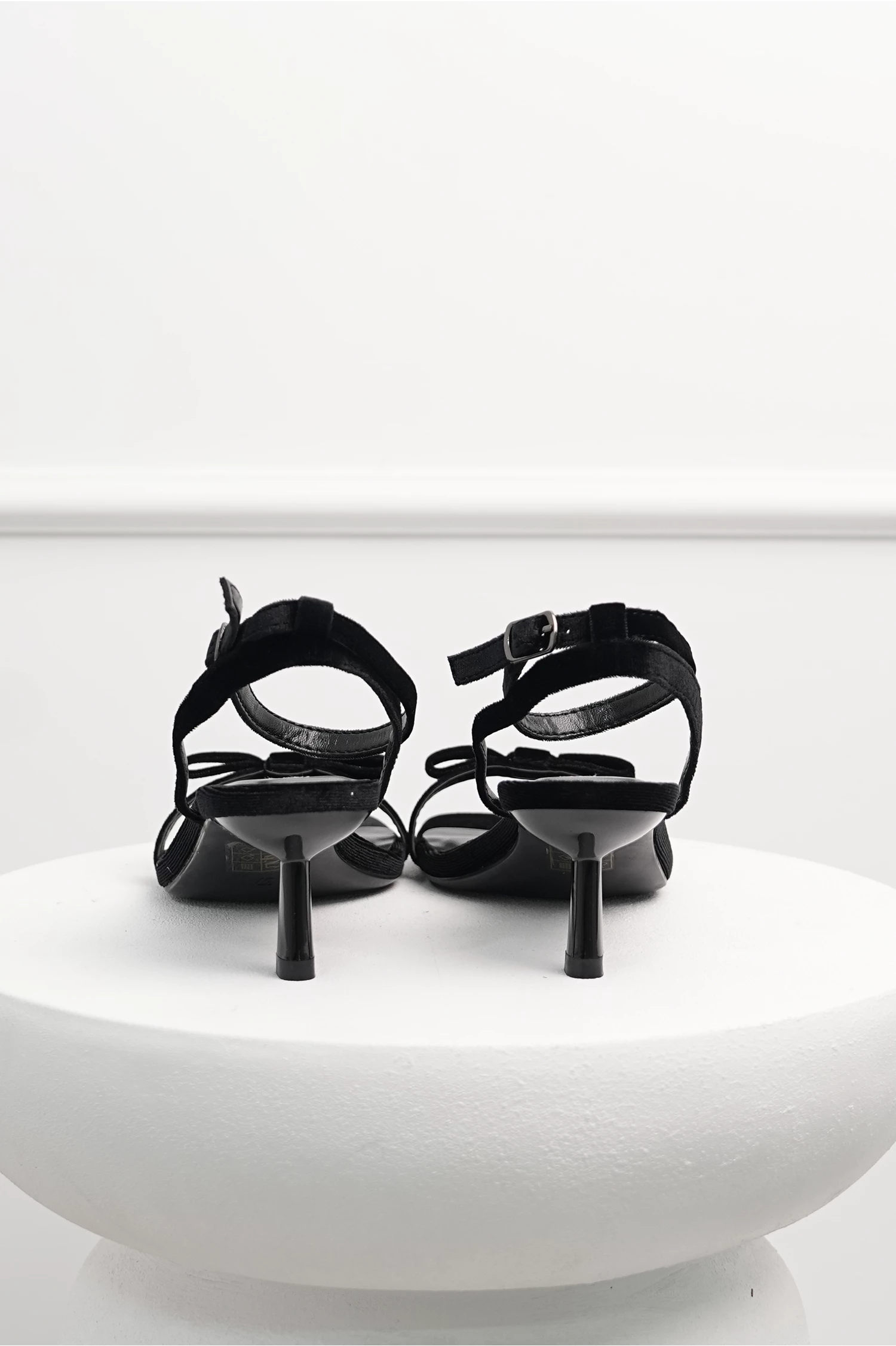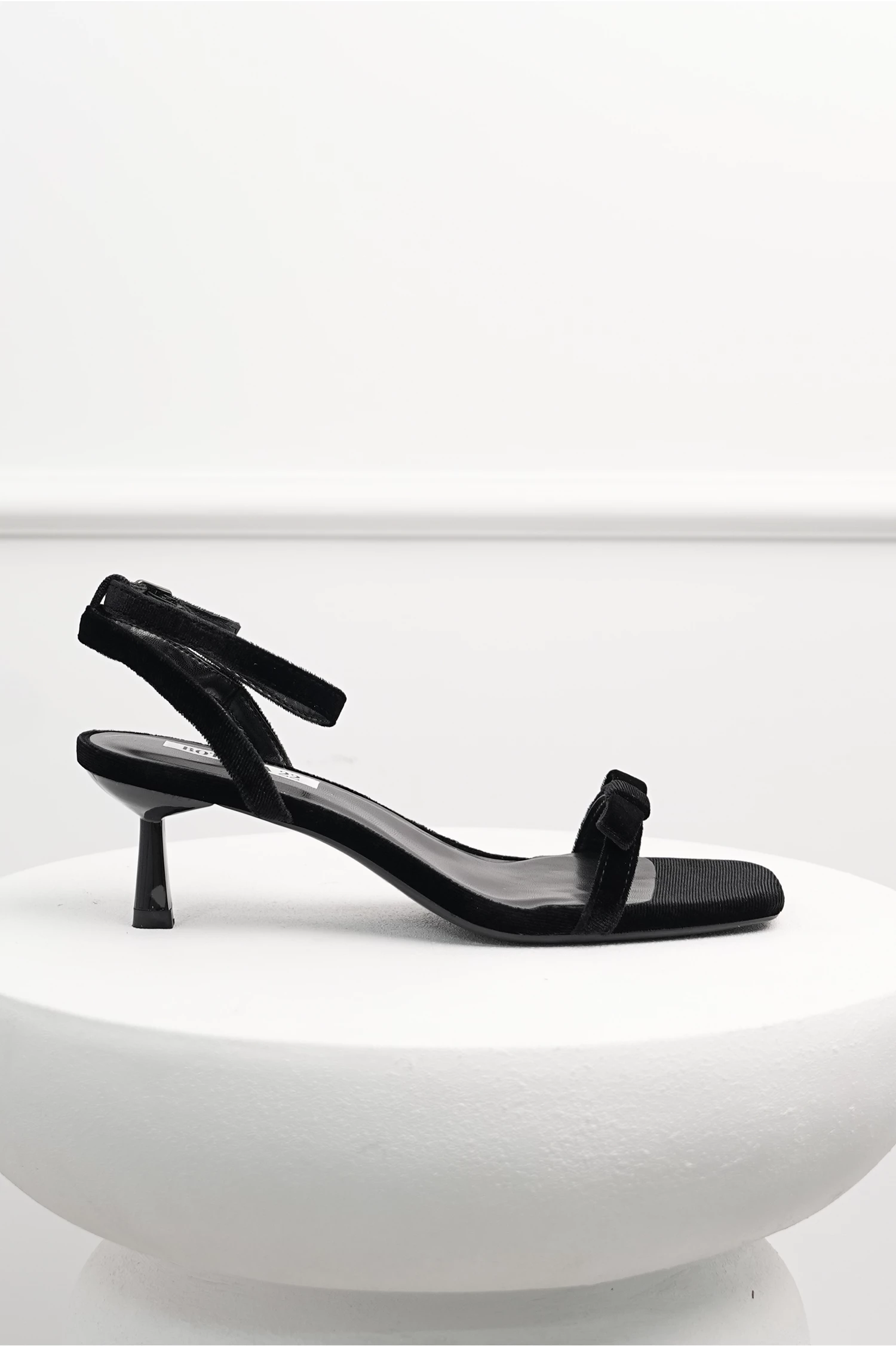 Sandale din catifea cu toc mic, ofera un echilibru intre eleganta si confort. Au barete subtiri si fundita discreta.